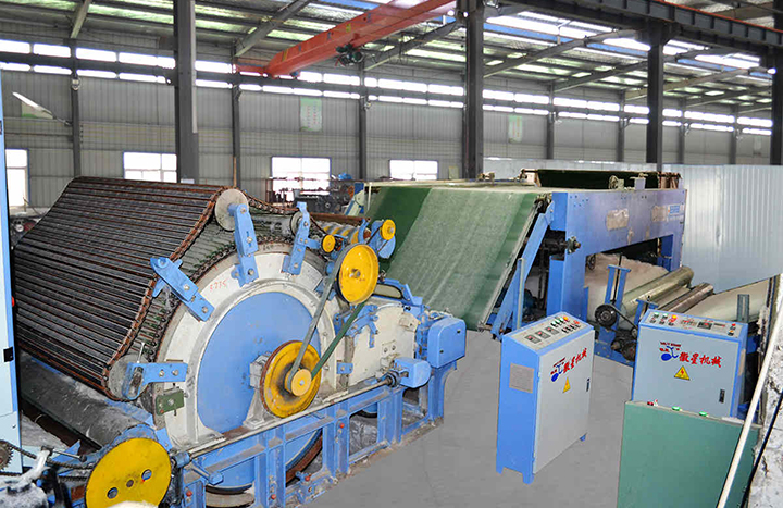 五、磨盤定型運棉部分:將棉紗與棉胎纖維磨合粘牢、起球,增加棉胎強度。采用四個平鋪磨盤,將棉胎每面揉磨兩次,使棉胎磨合更牢,起球更多,強度更高。